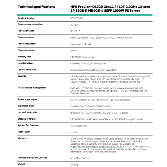 HPE ProLiant DL320 Gen11 4410Y 2.0GHz 12-core 1P 16GB-R MR408i-o 8SFF 1000W PS