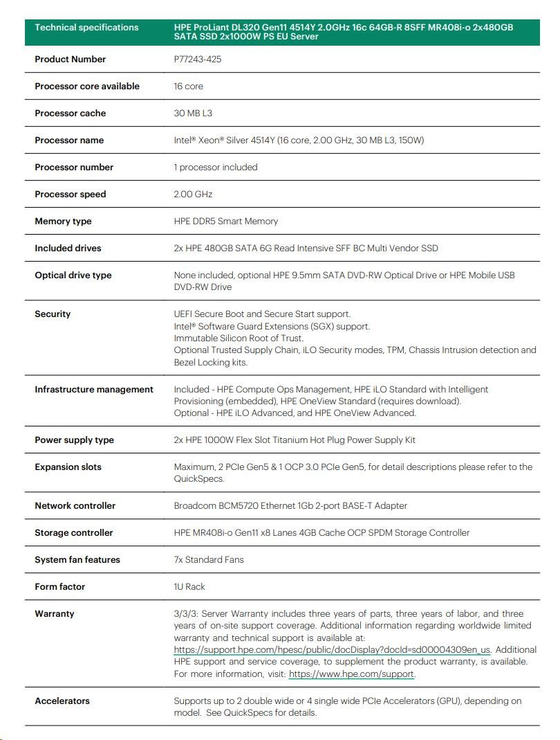 Model Name HPE PL DL320g11 4514Y (2.0/16C/4400) 2x32G 2x480G SATA SSD MR408i-o 8SFFBCU3 2x1000W 2x1Gb 1U EIR
