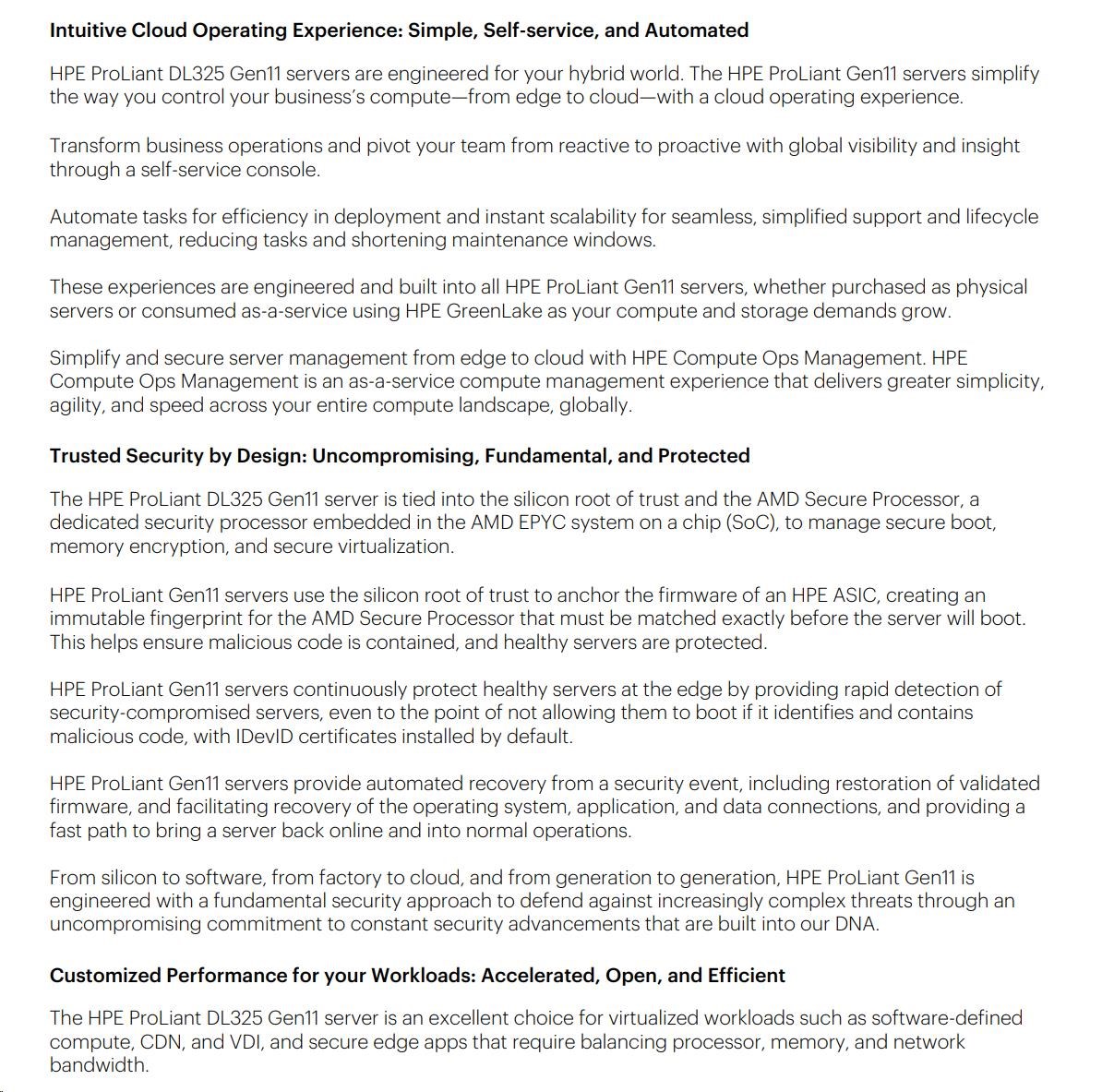 | Management | Default: HPE iLO Standard with Intelligent Provisioning, HPE OneView Standard (requires download) |