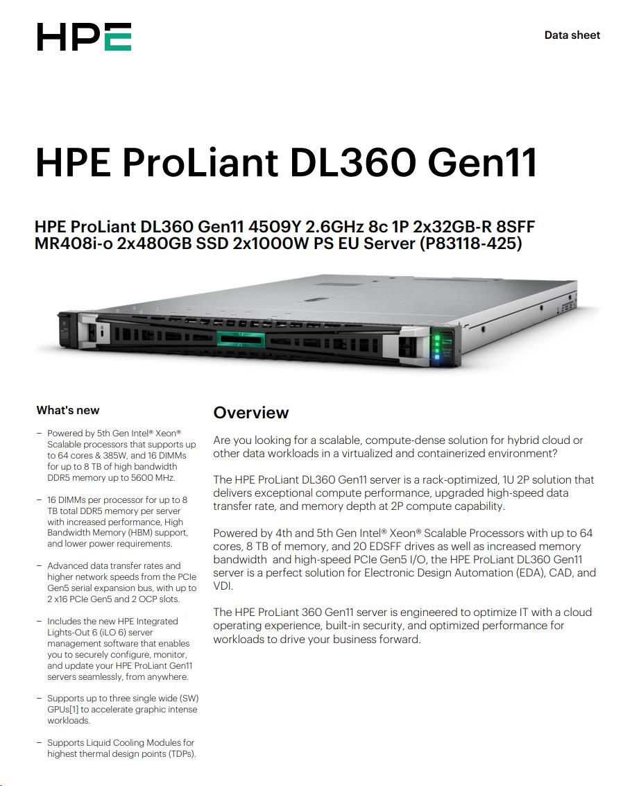 HPE PL DL360g11 4509Y (2.6G/8C) 2x32G (p64706) 2x480G 2x1000W MR408i-o 8SFF 4p1G ocp Smart Choice.