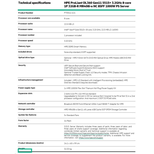 Model Name HPE PL DL360g11 5515+ (3.2/8C/165W) 1x32G MR408i-o/4G 8-10SFF 1x1000W 2x10G-T NBD333 1U