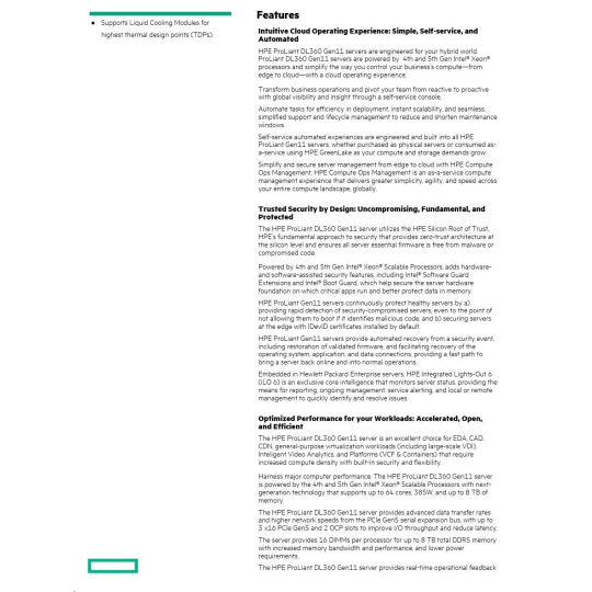 | Security | UEFI Secure Boot, Secure Start, Intel® SGX, Immutable Silicon Root of Trust, TPM, Chassis Intrusion Detection, Bezel Locking Kits |