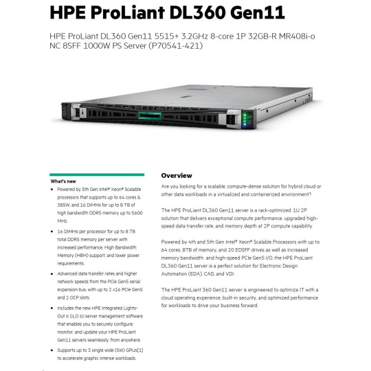 | Model Name | HPE ProLiant DL360 Gen11 5515+ 3.2GHz 8-core 1P 32GB-R MR408i-o NC 8SFF 1000W PS Server |