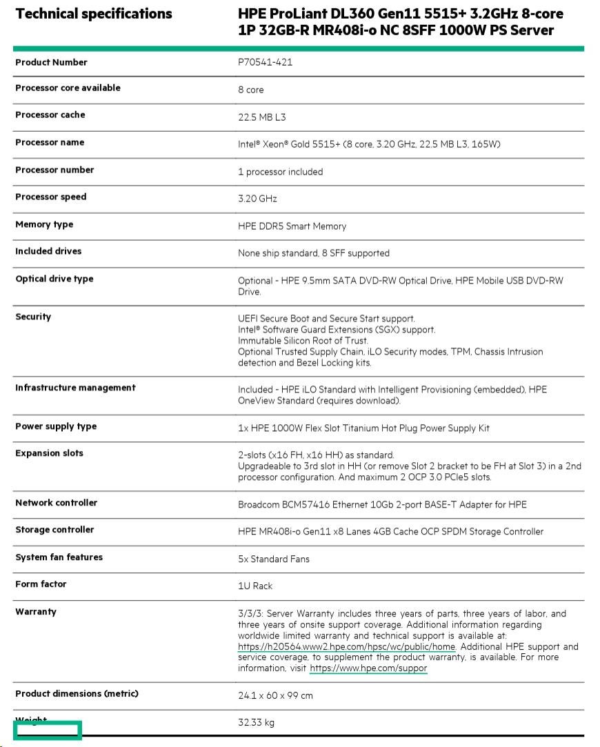 Model Name HPE PL DL360g11 5515+ (3.2/8C/165W) 1x32G MR408i-o/4G 8-10SFF 1x1000W 2x10G-T NBD333 1U