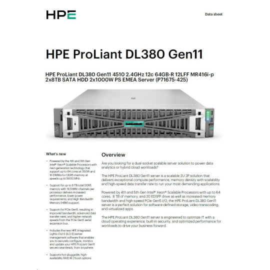 Model Name HPE PL DL380g11 4510 (2.4/12C/30M) 2x32G 2x8TB 2x1000W MR416i-p 12LFF 4x1Gb NBD333 2U