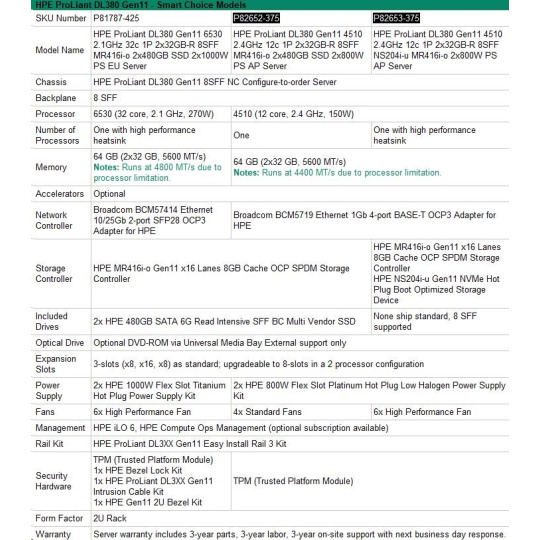 | Product Name | HPE ProLiant DL380 Gen11 6530 2.1GHz 32c 1P 2x32GB-R 8SFF MR416i-o 2x480GB SSD 2x1000W PS EU Server |