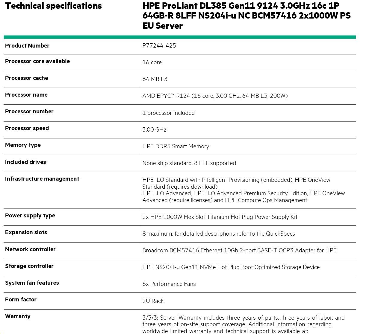 | Management | Default: HPE iLO Standard with Intelligent Provisioning, HPE OneView Standard (requires download) |