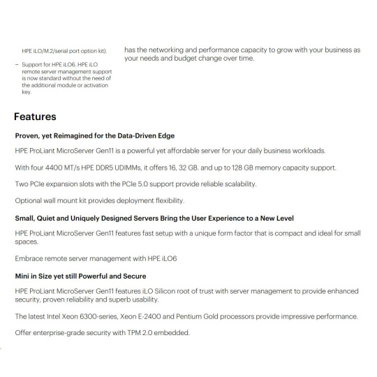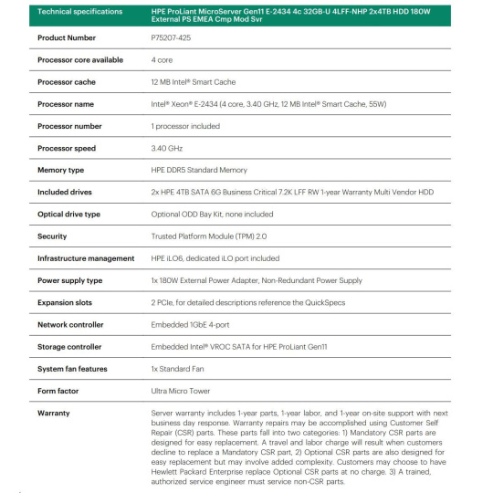 | Model Name | HPE ProLiant MicroServer Gen11 E-2434 4c 32GB-U 4LFF-NHP 2x4TB HDD 180W External PS EMEA Cmp Mod Svr |
