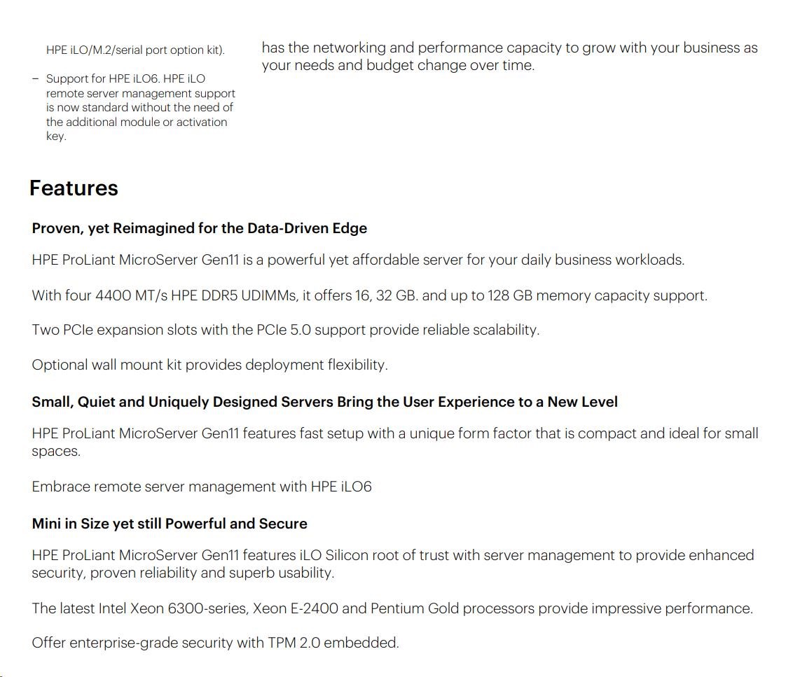| Model Name | HPE ProLiant MicroServer Gen11 E-2434 4c 32GB-U 4LFF-NHP 2x4TB HDD 180W External PS EMEA Cmp Mod Svr |