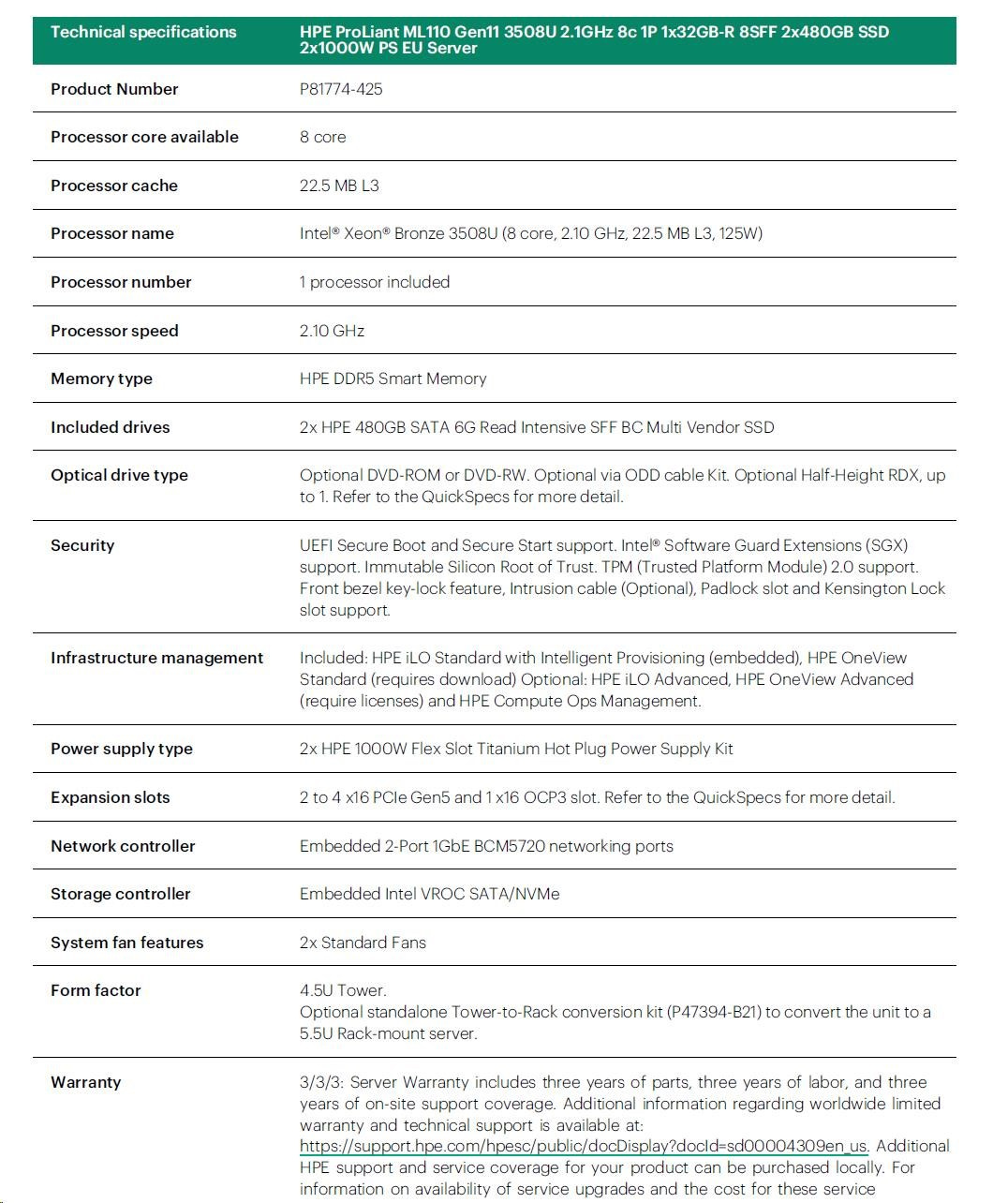 | Model Name | HPE ProLiant ML110 Gen11 3508U 2.1GHz 8c 1P 1x32GB-R 8SFF 2x480GB SSD 2x1000W PS EU Server |