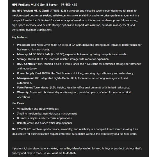 | Model Name | HPE ProLiant ML110 Gen11 4510 12-core 1P 64GB-R MR408i-o 8SFF 2x480GB SSD 2x1000W RPS EU Server |