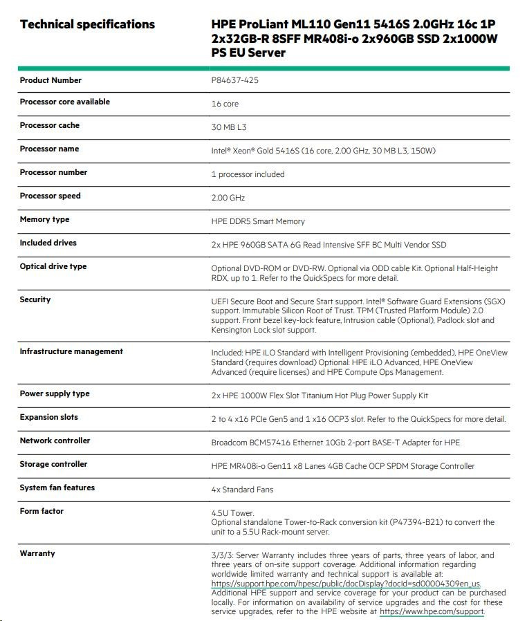 HPE PL ML110g11 5416S (2.0G/16C) 2x32G (p43328) 2x960G 2x1000W MR408i-o 8SFF 2p10GT Smart Choice