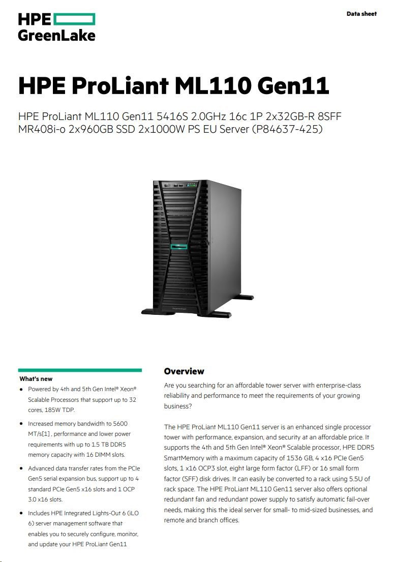 HPE PL ML110g11 5416S (2.0G/16C) 2x32G (p43328) 2x960G (p40498) 2x1000W MR408i-o 8SFF 2p10GT Smart Choice