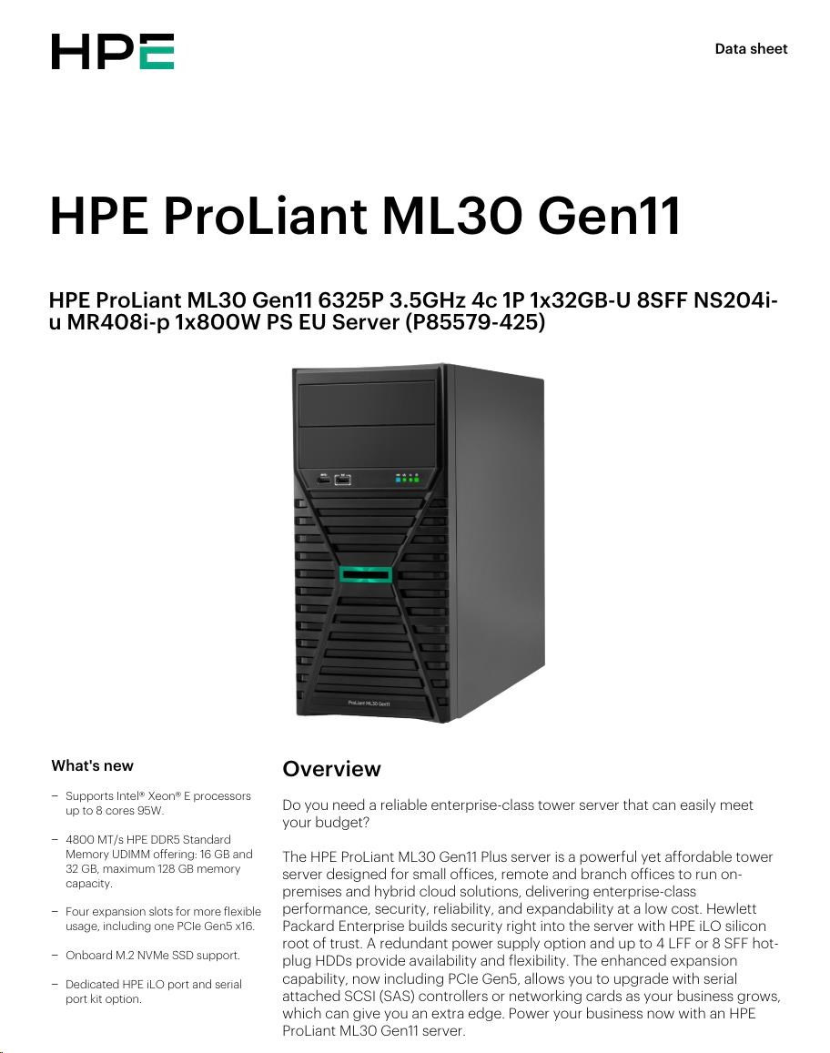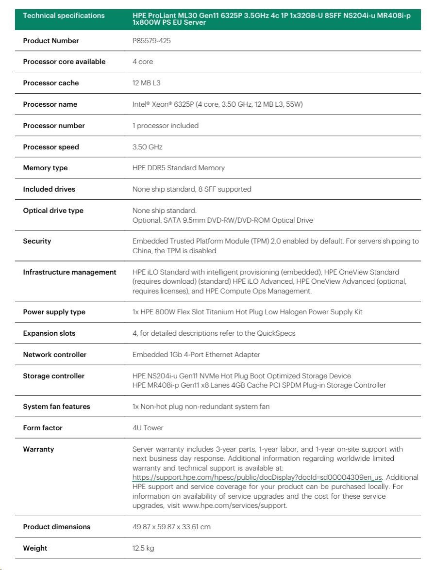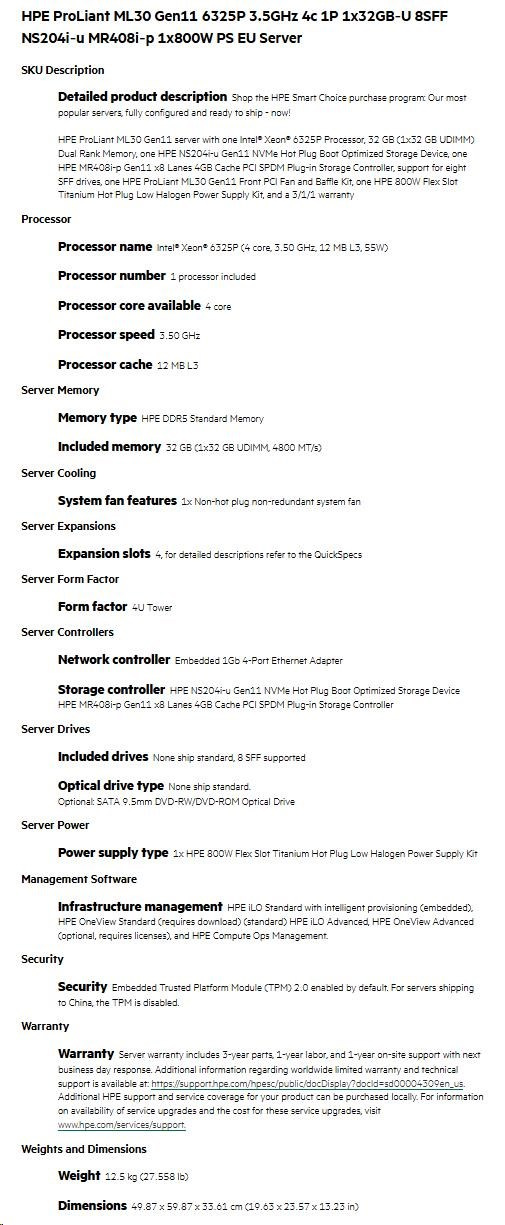 HPE PL ML30g11 6325P (3.5G/4C8T) 1x32G 8SFF NS204i-u(2x480g) MR408i-p/4G 2x800W 3/1/1 Smart Choice