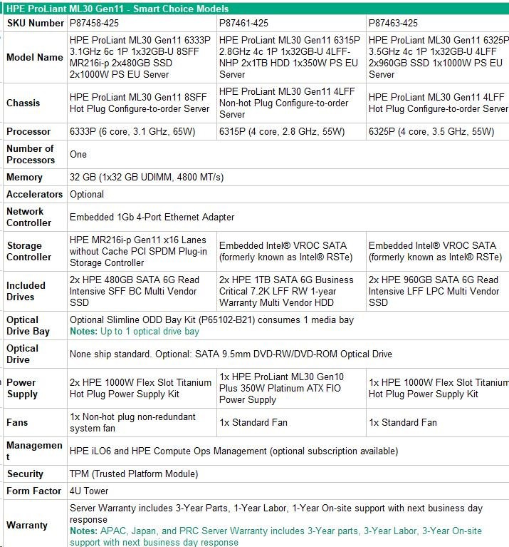 HPE PL ML30g11 6325P (3.5G/4C8T) 1x32G 2x960G SSD SATA 4LFF-HP VROC 1x1000W 4p1G NBD311 Smart Choice.