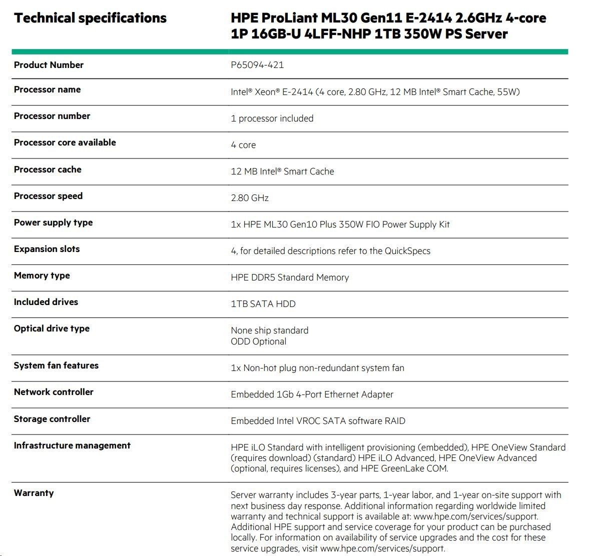 HPE PL ML30g11 E-2414 (2.6G/4C4T) 16G 1TB SATA 4LFF NHP VROC 350Wn
