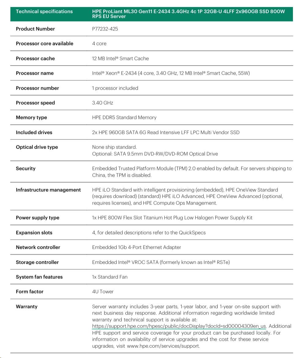 HPE ProLiant ML30 Gen11 E-2434 3.4GHz 4c 1P 32GB-U 4LFF 2x960GB SSD 800W RPS EU Server