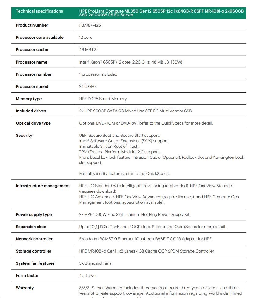 HPE PL ML350 Gen12 6505P (2.2/12C) 1x64G (P69728) 2x960G MR408i-o 8SFF 2x1000W 1GbE NBD333 Smart Choice.