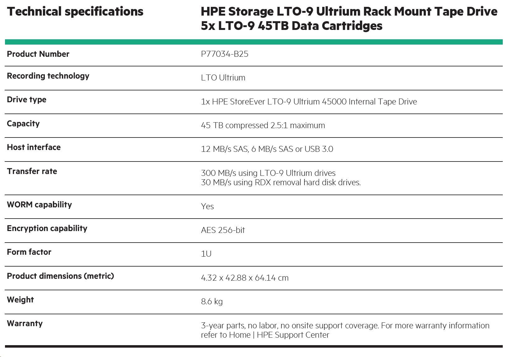 Technical specifications HPE Storage LTO-9 Ultrium Rack Mount Tape Drive 5x LTO-9 45TB Data Cartridges