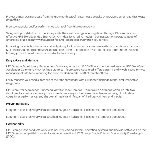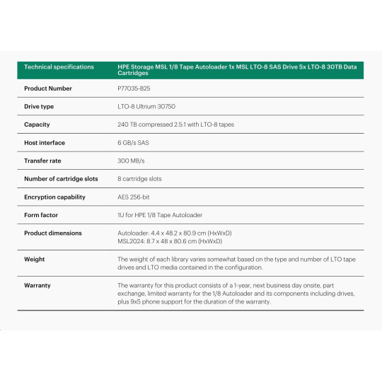 HPE Storage MSL 1/8 Tape Autoloader 1x MSL LTO-8 SAS Drive 5x LTO-8 30TB Data Cartridges.