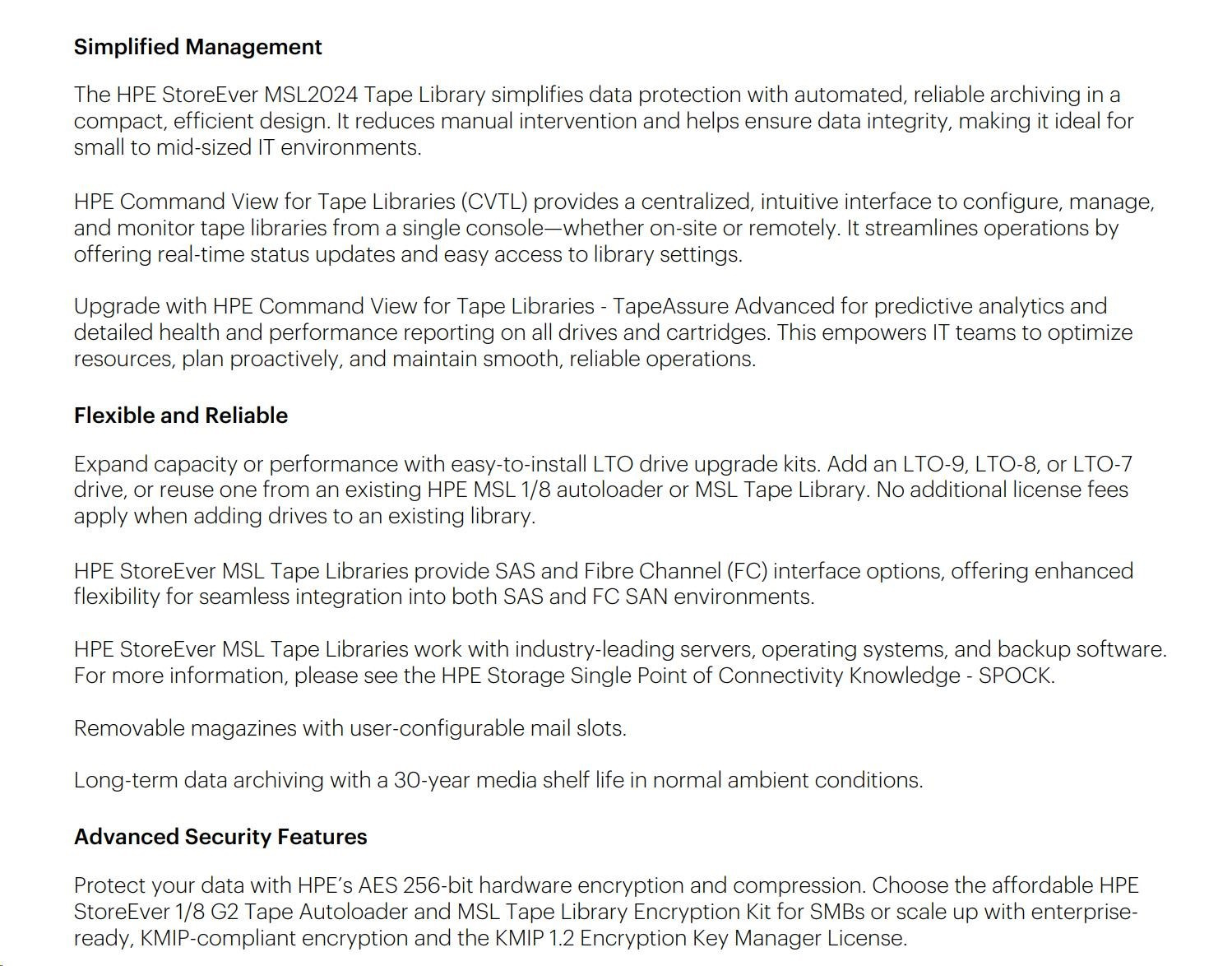 The HPE StoreEver MSL2024 Tape Library delivers reliable and cost-effective data protection for businesses requiring unattended backup, disaster recovery, long-term archival storage, and protection against cyber threats such as ransomware.