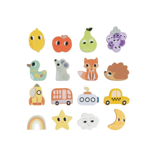 Společenská hra pro děti i celou rodinu Hmatej a najdi nabízí spoustu zábavy a možností ke hře. Hra, která dokonale potrénuje a zdokonalí motorické dovednosti, spočívá v hledání správného dřevěného předmětu v kyblíku, kdy pouze hmatem musí hráč najít požadovaný tvar. Hru můžete hrát různým způsobem a přizpůsobit ji věku i dovednostem každého hráče. Užijte si společné chvíle při hmatání a hledání zvířátek, dopravních prostředků a dalších tvarů..