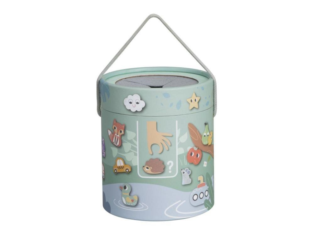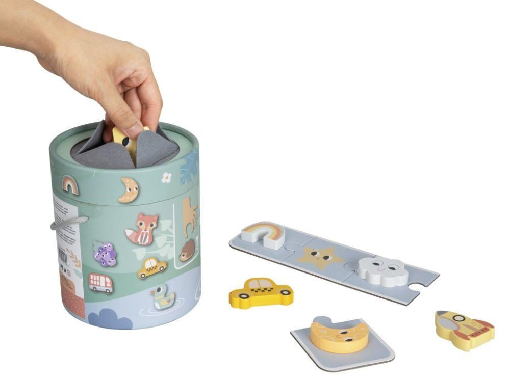 Společenská hra pro děti i celou rodinu Hmatej a najdi nabízí spoustu zábavy a možností ke hře. Hra, která dokonale potrénuje a zdokonalí motorické dovednosti, spočívá v hledání správného dřevěného předmětu v kyblíku, kdy pouze hmatem musí hráč najít požadovaný tvar. Hru můžete hrát různým způsobem a přizpůsobit ji věku i dovednostem každého hráče. Užijte si společné chvíle při hmatání a hledání zvířátek, dopravních prostředků a dalších tvarů..