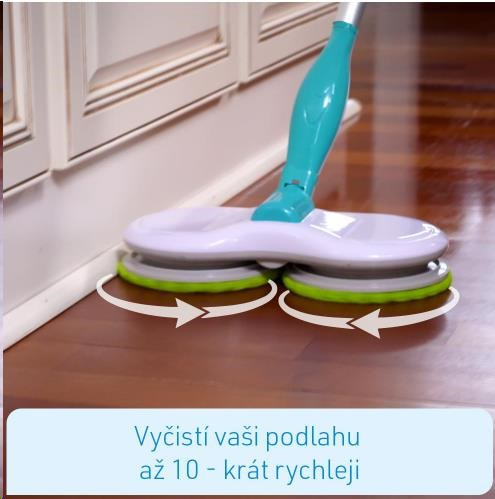 Dvě hlavy mopu vyčistí vaši podlahu s dvojnásobným výkonem a až 100 otáčkami za minutu! Speciální opakovaně použitelné návleky z mikrovlákna sbírají nečistoty pomocí tisících vláken a bezpečně ji zafixují!
