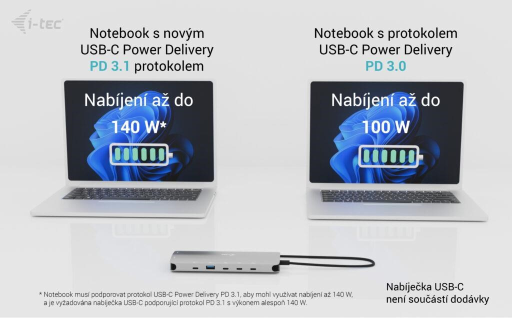 ** Pokud váš notebook nebo tablet podporuje nový a moderní nabíjecí protokol USB-C Power Delivery PD 3.1, dokovací stanice nabídne nabíjecí výkon až 140 W (pokud máte protokol PD 3.0, nabíjecí výkon bude až 100 W).