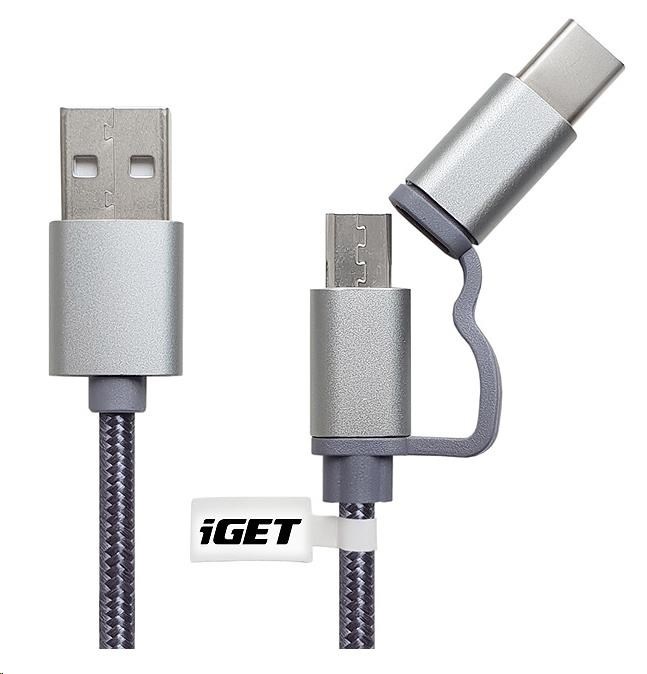 iGET G2V1 USB kabel 2v1, 1m, stříbrný, microUSB i USB-C, prodloužené koncovky