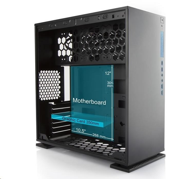 • Vevnitř je prostor pro grafickou kartu až do délky 350mm a CPU chladič až do velikosti 160 mm.