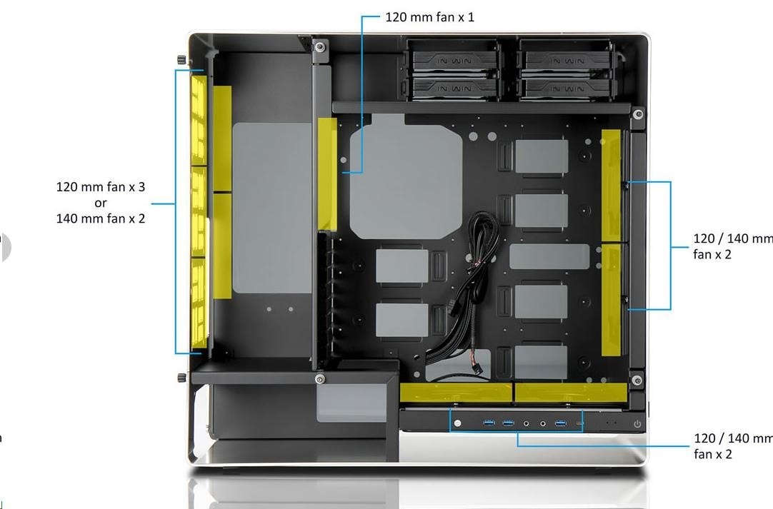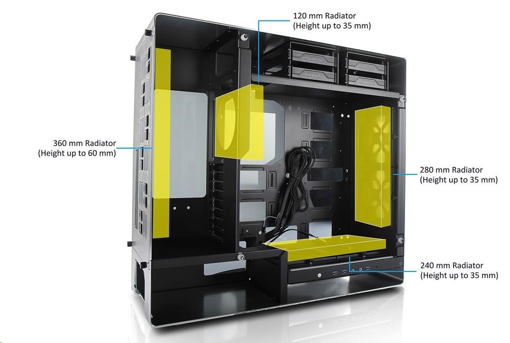 Oddělené pozice HDD a PSU zajišťují ideální proudění vzduchu skrz skříň ven zadními větracími otvory, aniž by se odvod teplého vzduchu brzdil o základní desky nebo grafické karty.