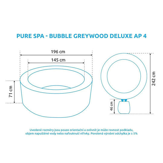 - Vnější průměr: 196 cm (po naplnění vodou, tolerance ± 5%)