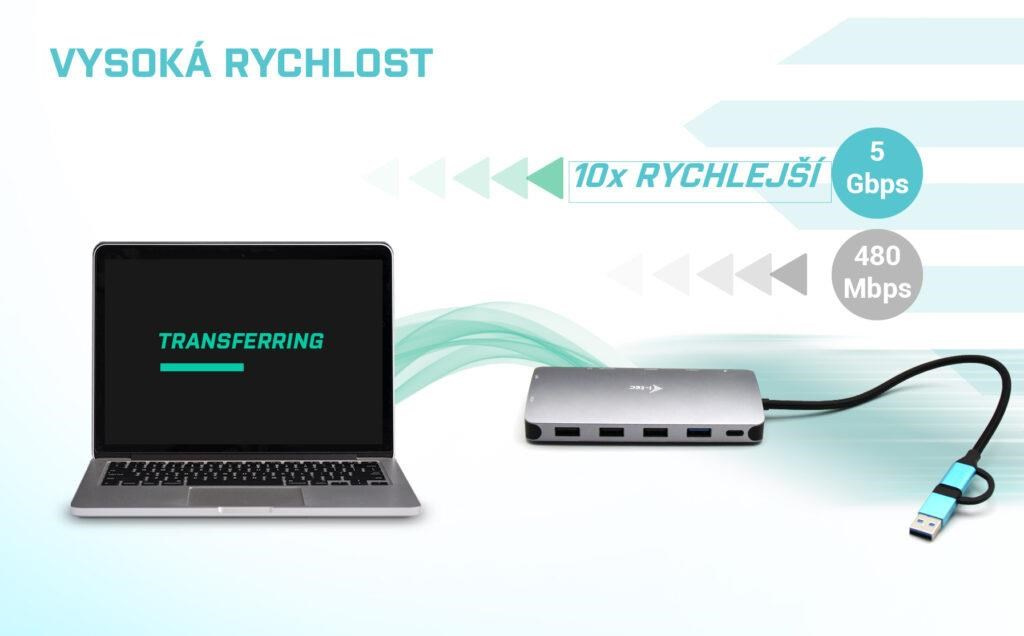 - Dokovací stanice podporuje až 100W napájení připojeného notebooku nebo tabletu