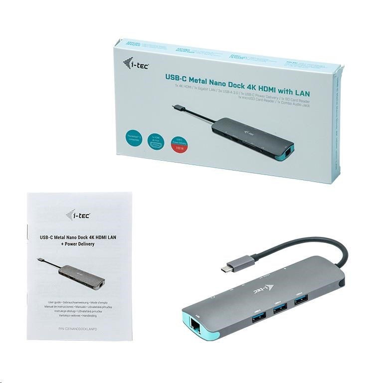 Dlouhý produktový popis: i-tec USB-C Metal Nano dokovací stanice – 1x HDMI 4K Ultra HD 3840×2160@30Hz, 1x čtečka SD karet, 1x čtečka microSD karet, 1x Ethernet GLAN RJ-45 port, 1x Combo audio jack, 3x USB 3.0 port, 1x USB-C Power Delivery port (100W), kompatibilní s Thunderbolt 3