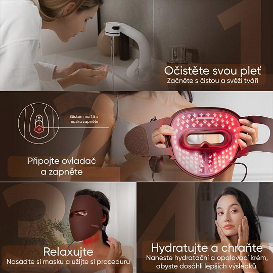 - Čtyři klinicky ověřené vlnové délky pro komplexní péči o pleť: modrá, jantarová, červená a blízká infračervená.