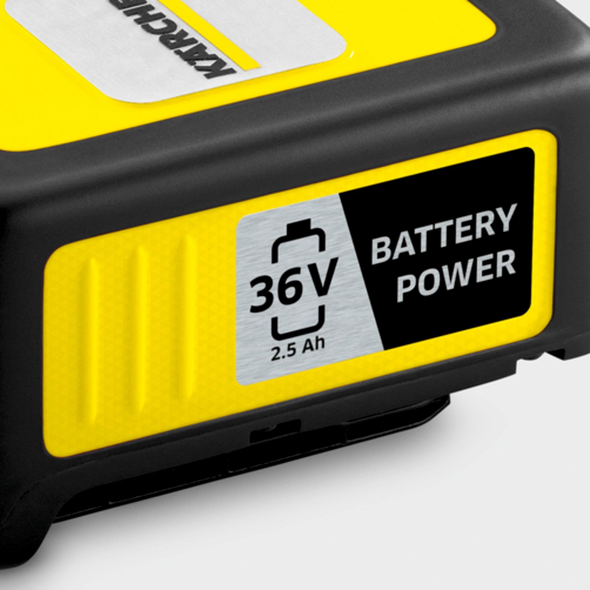 Sada pro všechna zařízení bateriové platformy Kärcher 36 V: Starter Kit Kärcher Battery Power 36/25, obsahující vyměnitelnou baterii 36 V / 2,5 Ah Kärcher Battery Power s inovativní Real Time Technology a dále 36V rychlonabíječku, která nabije baterii za pouhých 48 minut až na 80 procent.