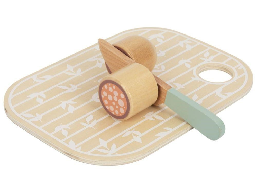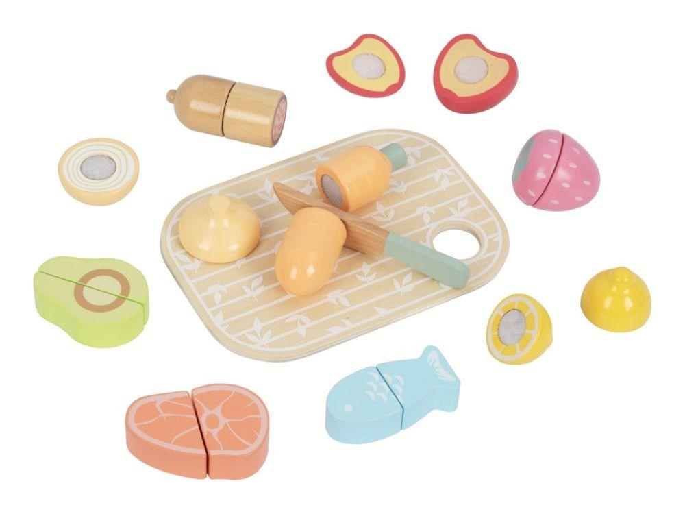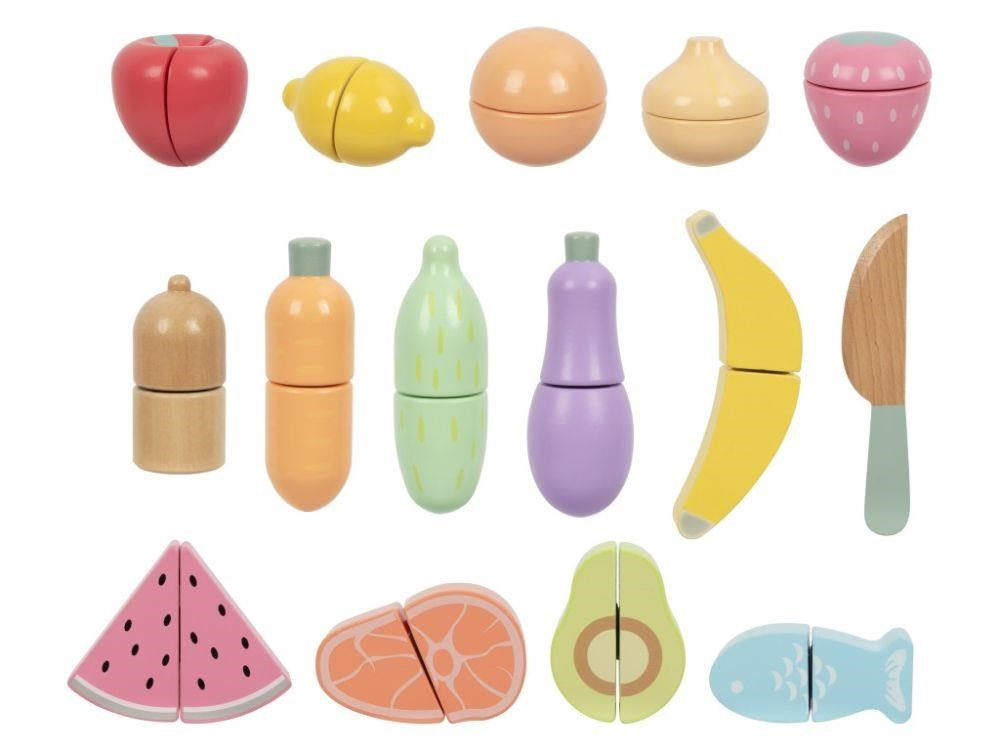 Sada dřevěných krájecích potravin uložená v praktickém a snadno přenosném boxu 3v1 umožní dětem přichystat hostinu doma i na návštěvě. Krájecí ovoce, zeleninu a další potraviny mohou děti pomocí dřevěného nože krájet (porcovat) na poloviny a pomocí suchého zipu poloviny opět spojovat. S krájecími potravinami si děti vyzkouší krájení bezpečným dětským způsobem a zdokonalí své dovednosti..