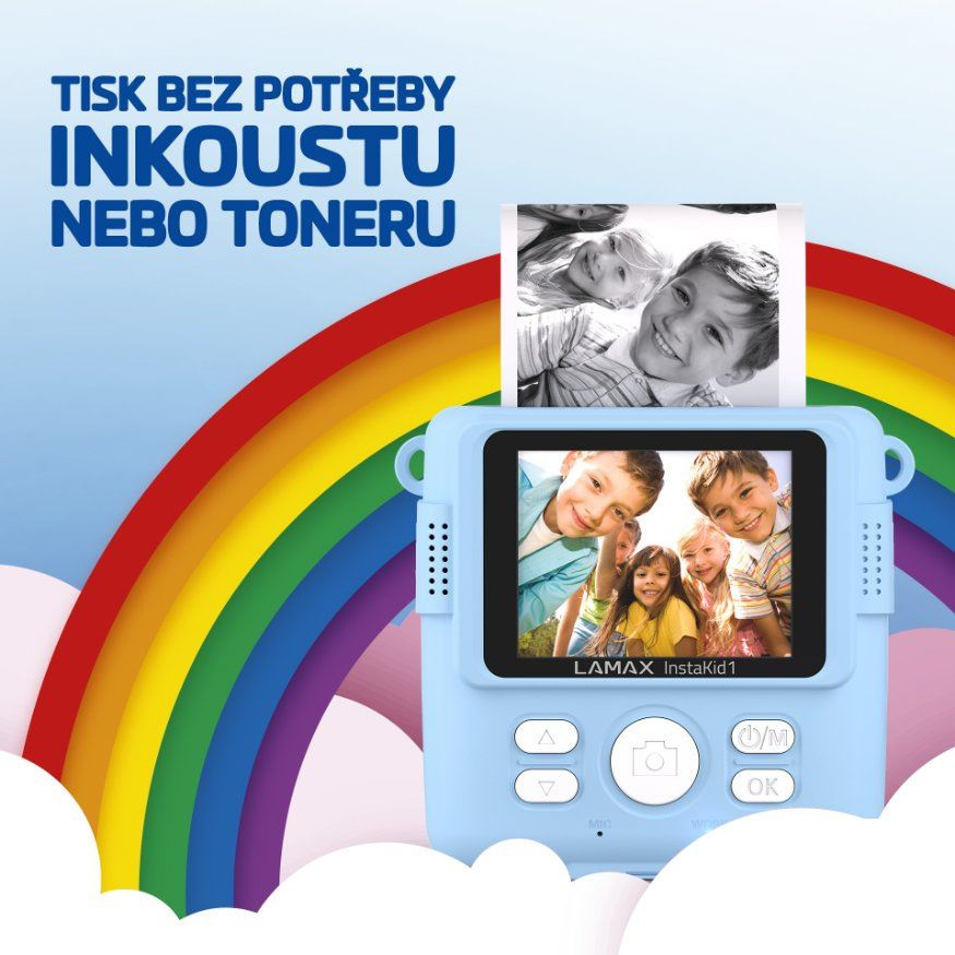 Dětský fotoaparát, okamžitý tisk na termopapír, až 100 fotek na jednu roli, 2.4'' displej, filtry, rámečky, efekty, jednoduché ovládání, nahrávání videa, české prostředí, hry, ukládání na microSD kartu, podpora MP3, bohatá výbava, 2 role termopapíru, 1 role nalepovacího termopapíru, šňůrka na krk..