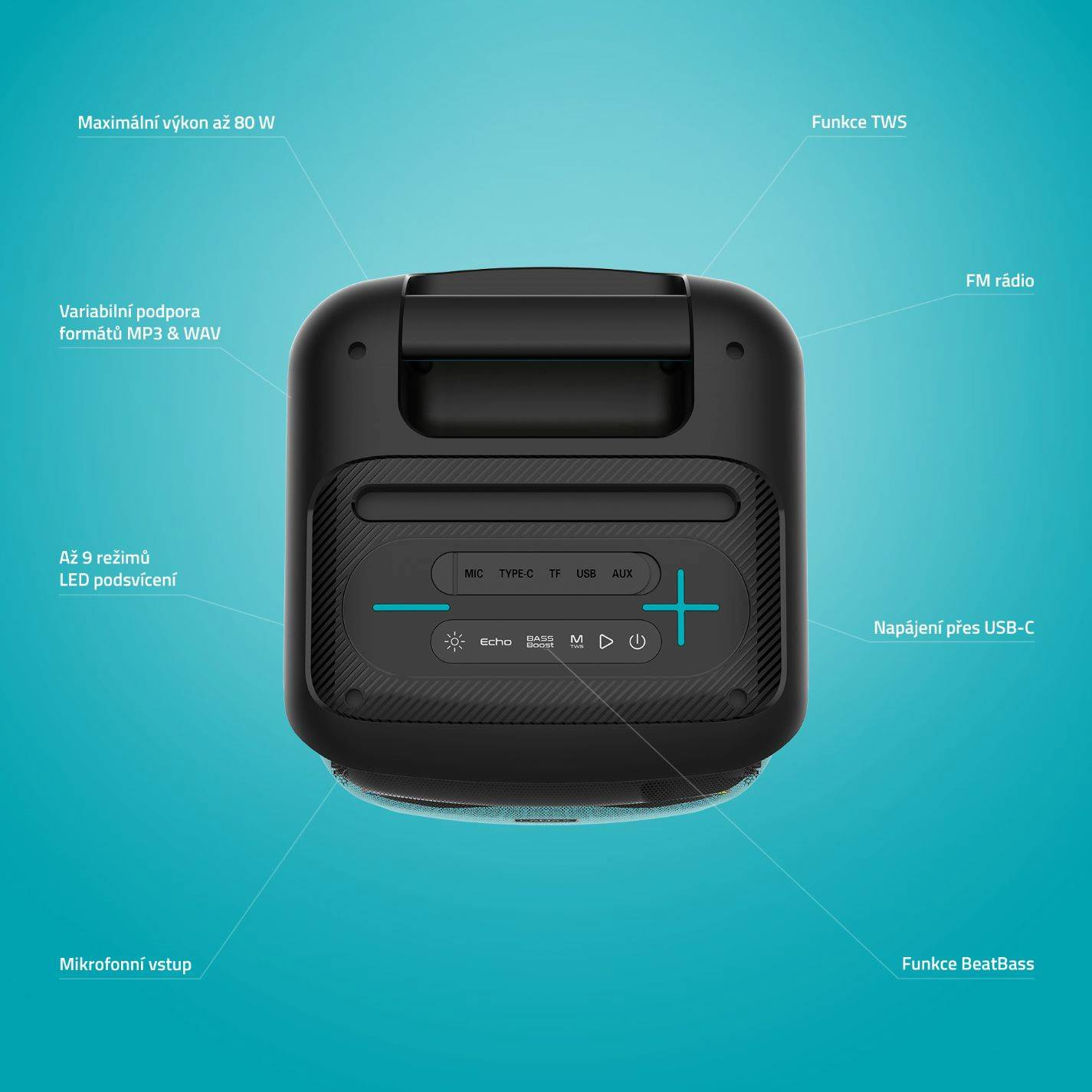 Způsob použití:Na párty; Outdoor použití; Výkon reproduktoru (W):80; Barva reproduktoru:Černá; LED světla; Typ připojení:Bluetooth, Jack 3,5 mm; Bluetooth verze:5.3; Slot MicroSD; Typ baterie:Li-Ion; Kapacita baterie (mAh):6000; Výdrž baterie (h):13; Hmotnost (g):4500; Způsob nabíjení:USB-C.... více