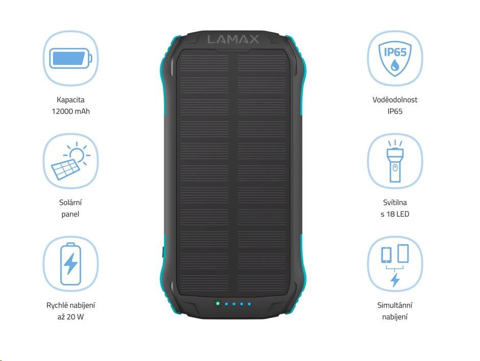 LAMAX Journey 12000mAh nabízí v malém těle hodně šťávy a zároveň tě ohromí maximálním výkonem 20 W. To v praxi znamená, že si běžný smartphone nabiješ do plných za 1,5 hodiny, a to až 3krát.