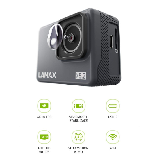 Tvoje kreativita bude jediným limitemZážitky jsou v životě nejvíc, tak si je uchovej i jinde než jenom v hlavě. Dokonalou paměť až 128 GB má totiž i akční kamera LAMAX X5.2, která s tebou vyrazí do každého dobrodružství. Zpětně si pak můžeš prohlédnout všechny detaily v reálném 4K 30fps. Ať už provádíš cokoliv, elektronická stabilizace MAXsmooth se postará o dokonale hladké záběry, takže celý obraz ve Full HD 60 fps je extra plynulý. Aby klíčové momenty neutekly příliš rychle, umí je funkce Slow motion zpomalit. Kamera je skvělý parťák nejen na souši, v pouzdře se s tebou potopí až do 40 m. Zkrátka velká paráda o vysoké kvalitě za skvělou cenu.