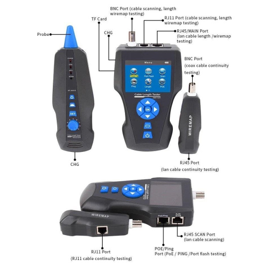 Pokročilý tester pro testování a diagnostiku různých typů kabelů/vedení. Využívá technologii TDR (Time Domain Reflectometry) k přesné lokalizaci a identifikaci závad ve vedení. Zařízení je vybaveno velkým LCD displejem, který zobrazuje všechny patřičné informace a podporuje vícejazyčné nastavení. Kromě toho je vybaven vestavěným tónovým generátorem a funkcí vyhledávání portů, takže je ideální pro testování síťových kabelů, telefonních linek a videokabelů. - Tester nabízí širokou škálu funkcí pro různé typy testování a diagnostiku. - Tester UTP/STP (RJ-45), koaxiálních (BNC), telefonních (RJ-11) a USB vedení. - Ohmické metody měření, včetně rozšířených testů napájení PoE a odezvy PING. Výbava: detekční sondy pro vyhledávání kabelového spojení, 1x protismyčka, barevný LCD displej