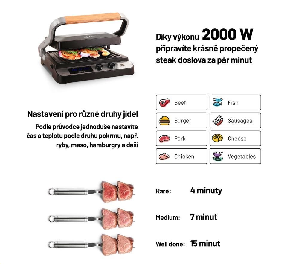 Gril se díky výkonu 2000 W rozehřeje velmi rychle a poradí si i se steaky, které vyžadují prudké opečení při vysoké teplotě.