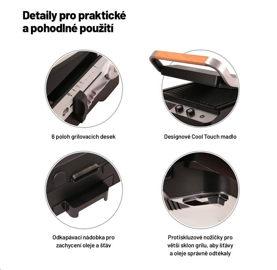 Plotýnky grilu mají nastavitelnou polohu. Můžete například upravit výšku a sklon plotýnky tak, aby se snížil tlak působící na křehké suroviny, jako jsou třeba čerstvé ryby. V BBQ módu si u každé z plotýnek můžete nastavit požadovanou teplotu ohřevu separátně. Se správnou volbou teploty pro jednotlivé druhy potravin vám pomůže přiložený průvodce. Zároveň si pro každý pokrm můžete nastavit požadovaný čas přípravy, takže se nemusíte bát, že netrefíte správný stupeň propečení. Gril je vybaven i funkcí automatického vypnutí, díky vysokému výkonu se velmi rychle rozehřeje a o průběhu přípravy máte přehled díky LED displeji. V nabídce jsou i ploché plotýnky pro ještě širší možnosti grilu.