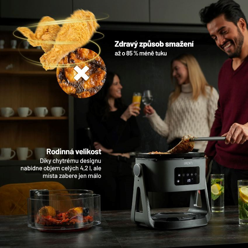 Horkovzdušná fritéza s grilem díky vysokorychlostní 360° cirkulaci vzduchu ušetří čas strávený v kuchyni, energii i zdraví. Nastartuje vaši cestu lepšího životního stylu, neboť oblíbená smažená jídla připraví s využitím až o 80 % menšího množství tuku. Rovnoměrného propečení dosahují pokrmy pronikáním infračerveného světla. Ještě více možností přípravy jídel poskytuje unikátní technologie umožňující otáčení horní části o 180°, a to především ve spojení s grilovací a hlubokou pánví, jež jsou součástí balení.