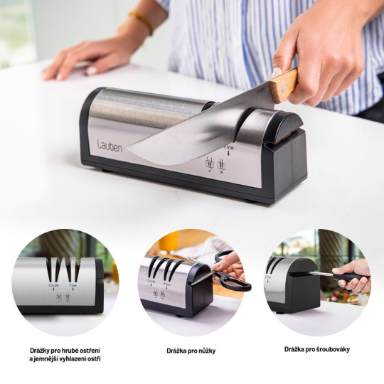 Díky Lauben Knife Sharpener 4700SB nabrousíte většinu nožů a sekáčků v pohodlí domova. Přidali jsme i speciální slot na broušení nůžek, i s těmi se tedy bruska Lauben poradí. Bruska umožňuje dva stupně broušení – hrubé a hladké začištění. Díky vodicím drážkám pro udržení správného sklonu a optimálnímu brusnému úhlu 15° zvládnete dokonale nabrousit každé ostří jako profesionál. Stačí brusku zapojit, spustit a vložit ostří, které chcete nabrousit.