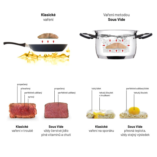 Díky metodě sous vide nikdy nepřijdete o cenné vitaminy a živiny z ingrediencí pokrmů. Příprava navíc probíhá jen s malým množstvím tuku. Nejen, že dostanete z jídla maximum při vynaložení minimálního úsilí, ale oproti klasickým metodám vaření nepotřebujete do jídla přidávat nezdravé tuky, které jindy bývají k přípravě nezbytné.