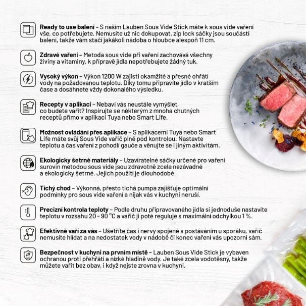 Chcete si pochutnat na vynikajícím, zdravém jídle, jehož příprava vám nezabere celé odpoledne? Chcete si doma připravit maso, co se bude rozpadat na jazyku, ale přitom neztratí na objemu a vždy si zachová svůj tvar a barvu? Nemusíte nutně chodit do restaurace. Lauben Smart Sous Vide je ideálním pomocníkem do kuchyně pro každého, kdo chce ušetřit hodiny strávené u sporáku, a přesto dostat z ingrediencí maximum. Díky metodě vaření sous vide si připravovaná jídla zachovají všechny chutě, vůně a živiny, o které nechcete při vaření přijít. Vařič jednoduše zapnete a ponoříte do hrnce s potravinami připravenými ve speciálních zip lock sáčcích, které jsou součástí balení. O ostatní už se Lauben Smart Sous Vide postará, vy si jen vychutnáte famózní výsledek.