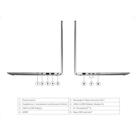 | Standartné porty | 1x USB-A (USB 5Gbps / USB 3.2 Gen 1) 1x USB-A (USB 5Gbps / USB 3.2 Gen 1), Always On 2x USB-C® (Thunderbolt™ 4 / USB4® 40Gbps), with USB PD 3.0 and DisplayPort™ 2.1 1x HDMI® 2.1, up to 4K/60Hz 1x Headphone / microphone combo jack (3.5mm) |